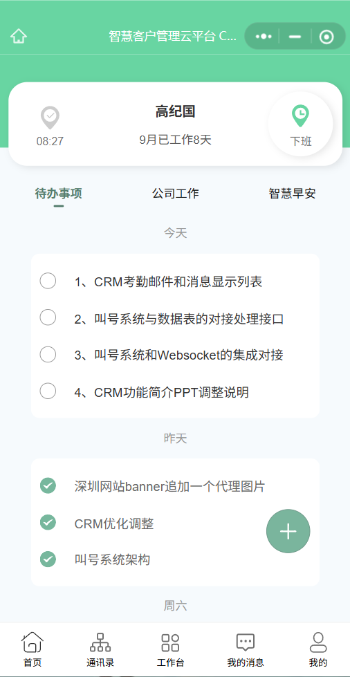功能简介:通过手机端实现上班和下班打卡考勤,跟踪客户登记、跟进记录登记、上门拜访拍照登记、直接拨打客户电话跟踪、客户资料共享等